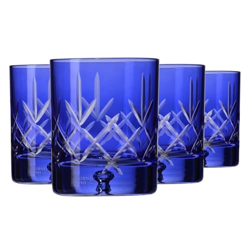 Krosno Whisky Glasses Set of 4 - Blue Crystal Whiskey Tumblers for Bourbon and Scotch - 250 ml Handcrafted Cut Glass - Rocks Glasses in Gift Box - Saga Collection