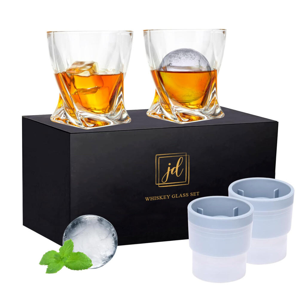 Whisky Glass, Set of 4 (2 Crystal Tumbler Glasses, 2 Large Ice Ball Moulds) in Gift Box - 330ml Whiskey Glasses for Scotch Cocktail Rum Cognac Vodka