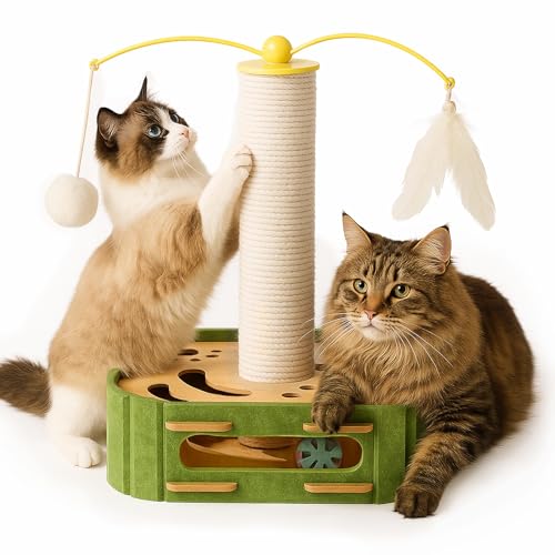 KDULPG Multifunctional Cat Scratching Post – Tall Indoor Cat Toys with Feather Teaser, Toy Balls, Puzzle Maze, Bell Ball & Catnip Ball (green)