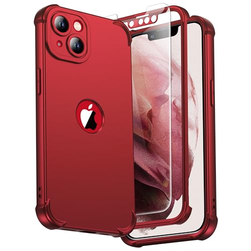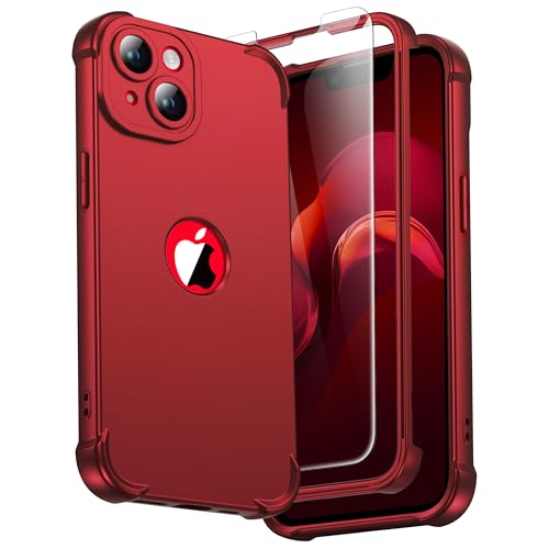 ORETECH for iPhone 13 Case, with [2 Pack Tempered Glass Screen Protector] [Camera Lens Guard] [15FT Military Grade Drop Test] 360° Shockproof Slim Fit Rubber Bumper Phone Cover - Red