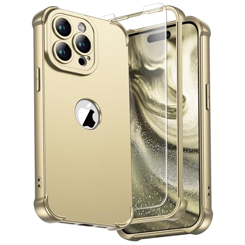 ORETECH for iPhone 15 Pro Case 6.1 inch, with [2 Pack Screen Protector] [Camera Lens Guard] [15FT Military Grade Drop Test] 360° Shockproof Slim Fit Design Rubber Bumper Phone Cover - Gold