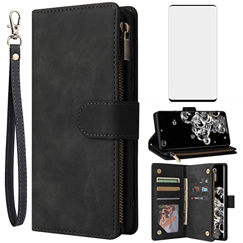 Asuwish Compatible with Samsung Galaxy S20 Ultra Glaxay S20ultra 5G Wallet Case Tempered Glass Screen Protector and Flip Cover Card Holder Cell Phone Cases for Gaxaly 20S S 20 A20 20ultra G5 Men Black