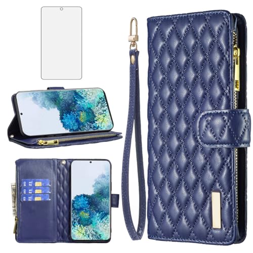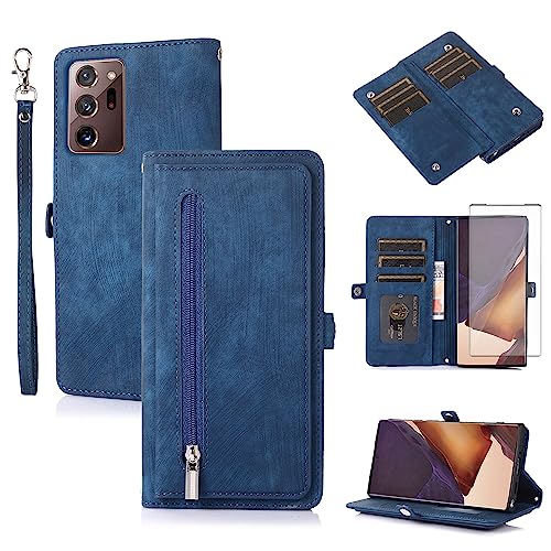 Asuwish Phone Case for Samsung Galaxy Note 20 5G Wallet Cover With Tempered Glass Screen Protector and Leather Flip Zipper Credit Card Holder Stand Cell Note20 Notes 20s Twenty Not S20 Women Men Blue