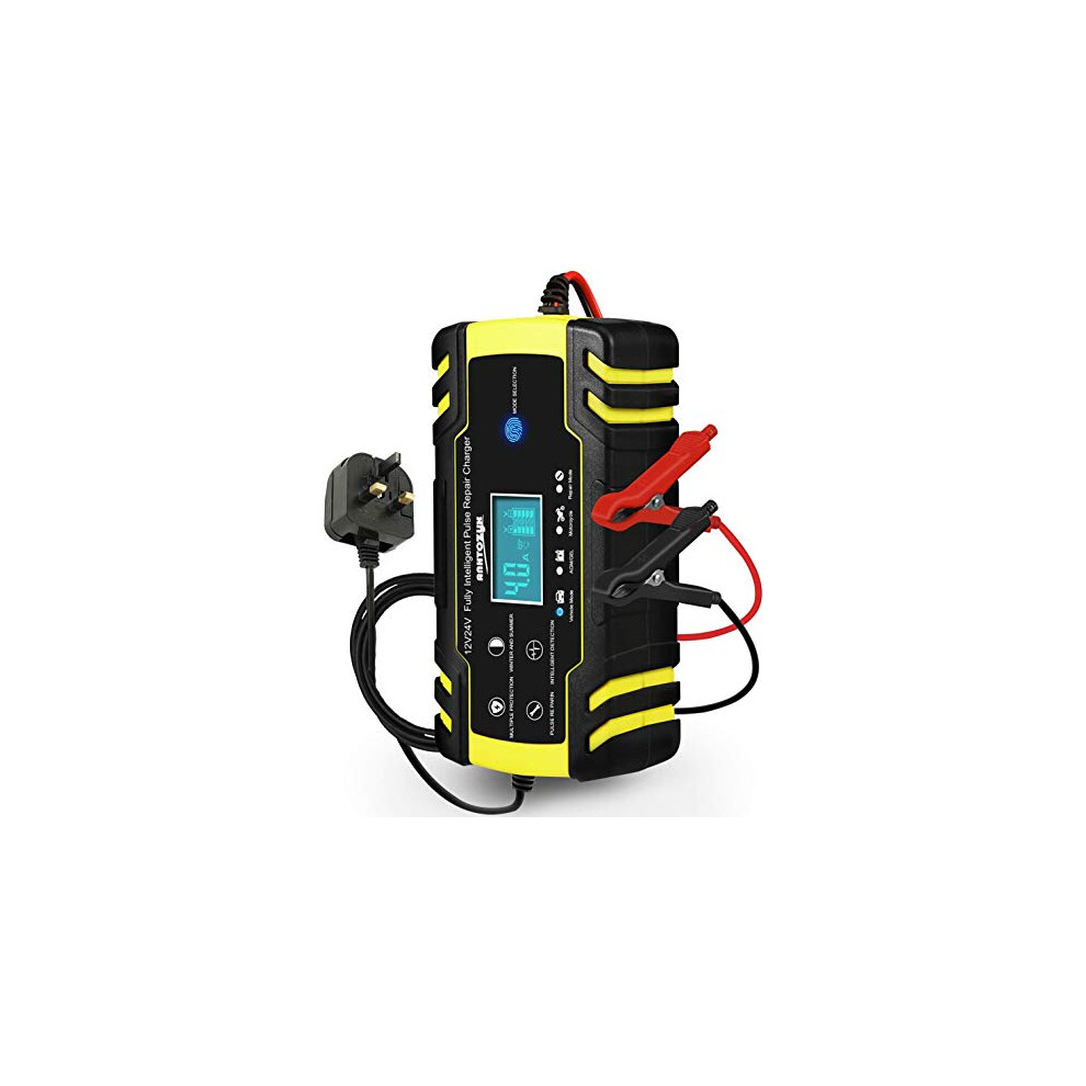 HAUSPROFI 12V/24V 8Amp Automatic Battery Charger with 3-Stage Charging, 6 Modes, LCD Screen, Intelligent Charging, Repairs, Maintains Car, Motorcycle, Boat, Mower Battery