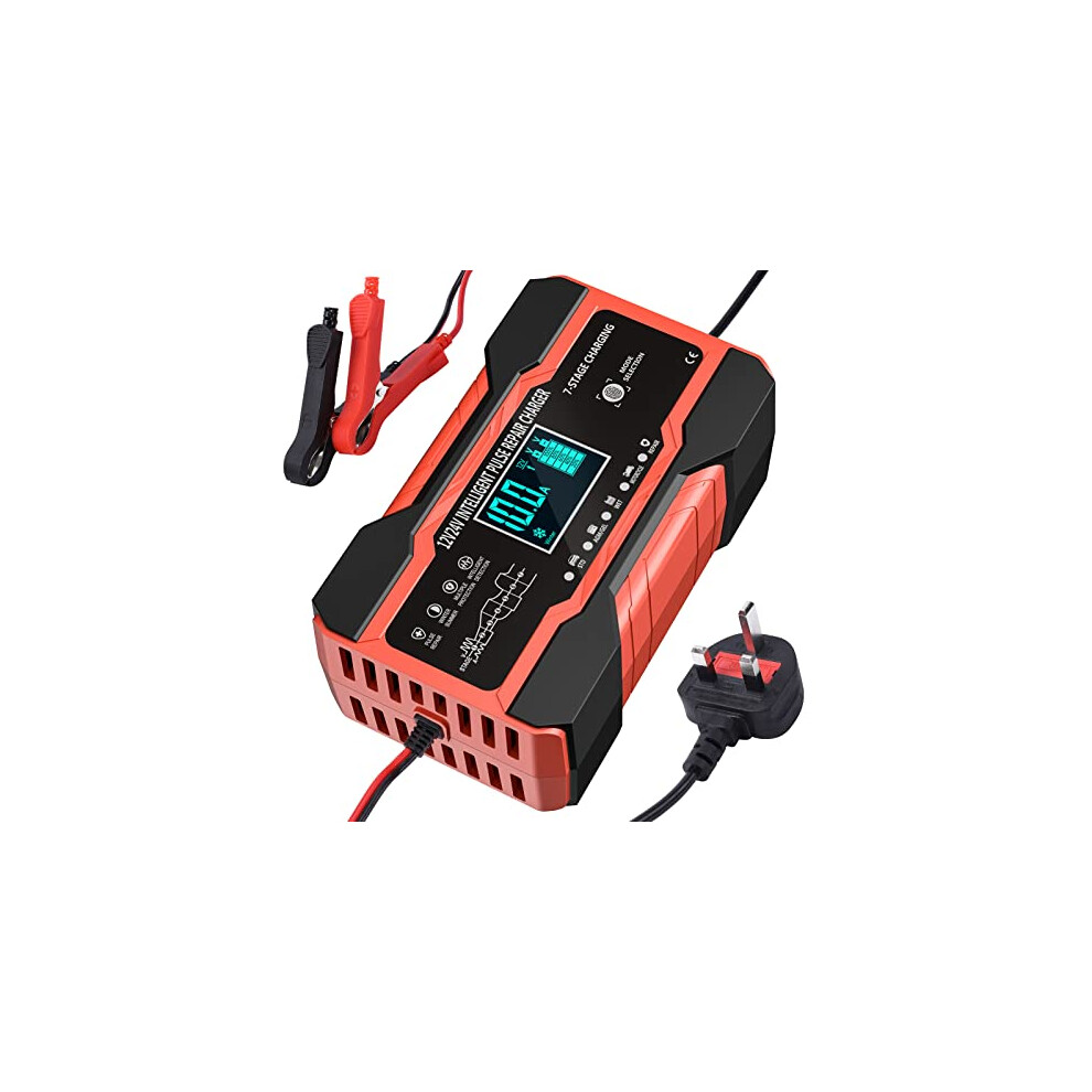 10 Amp Car Battery Charger, 12V/24V Automatic Battery Charger with 7-Stage Charging and LCD Screen, Intelligent Charges, Repairs, Maintains for Car M