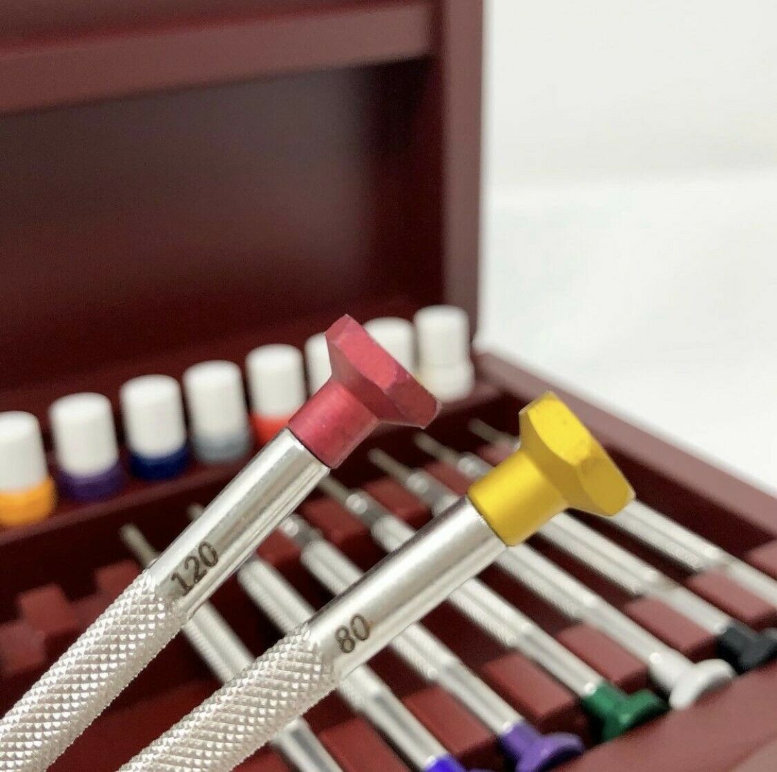 Screw Driver Set of 9 with Anodised Coloured Tips 9 Extra Ends Wooden Box New