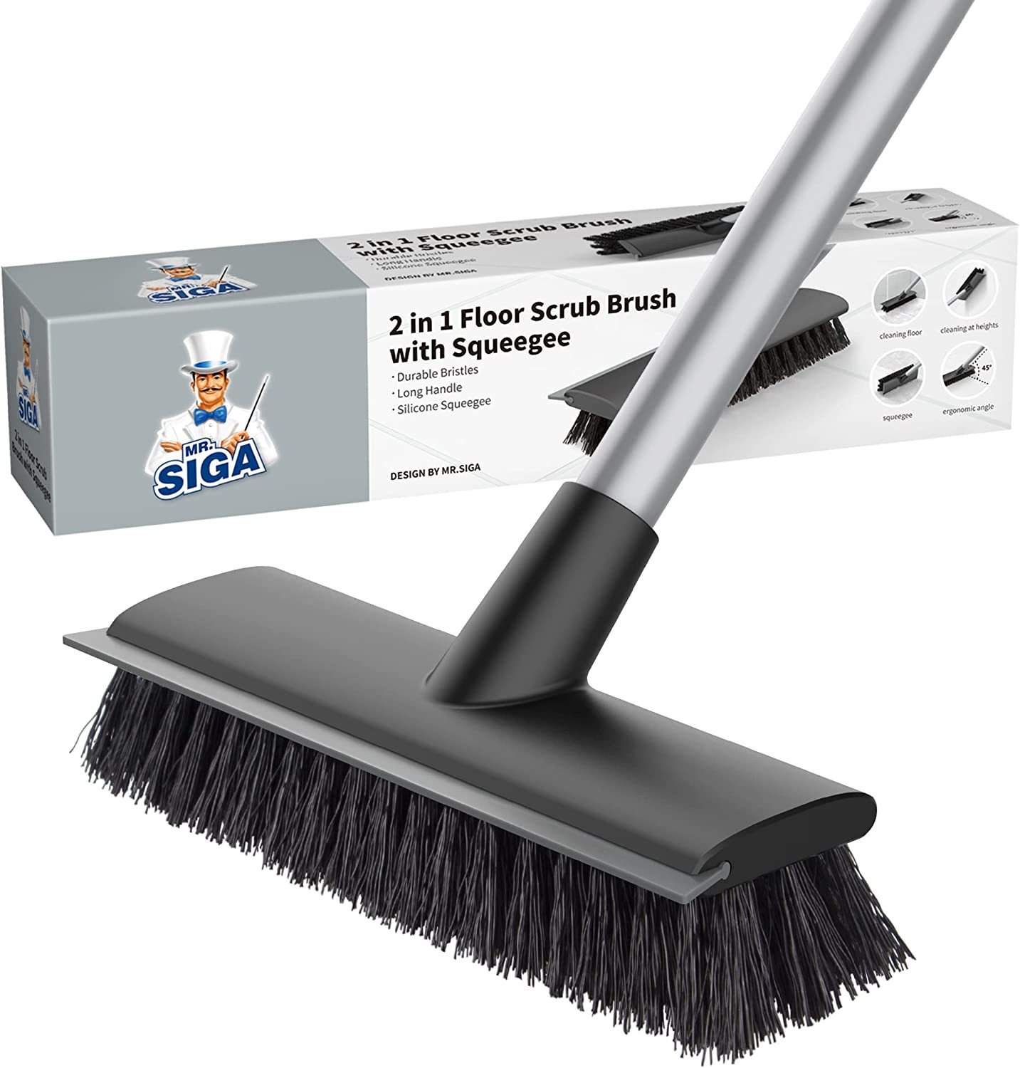 MR.SIGA Floor Scrub Brush with Long Handle, 2 in 1 Floor Scrubber and Squeegee for Cleaning Bathroom, Patio, Garage, Wall, Tile Scrub Brush with Stiff Bristles