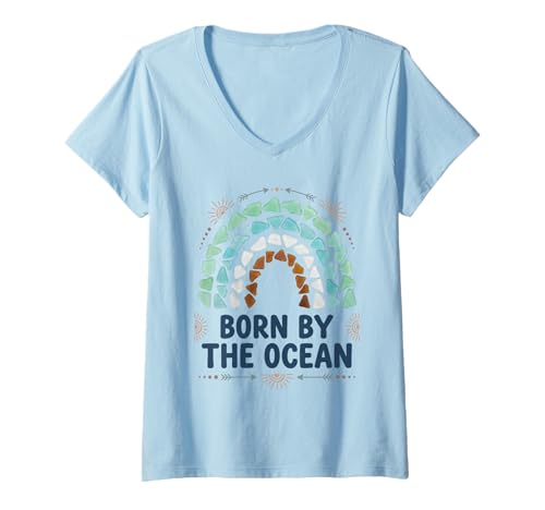 Women's Born by The Ocean Sea Glass Boho Rainbow Coastal Beach V-Neck T-Shirt