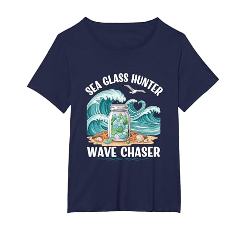 Sea Glass Hunter Wave Chaser Beach Collector Spirit T-Shirt, Women's Plus, Navy Blue, 5X