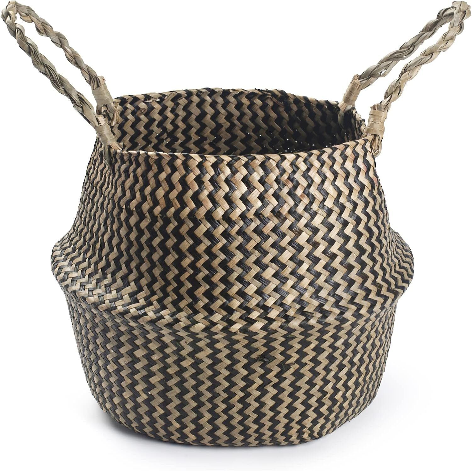 Seagrass Belly Basket Woven Plant Pot with Handles Natural Foldable for Storage Laundry Blankets Toys (Natural + Black)