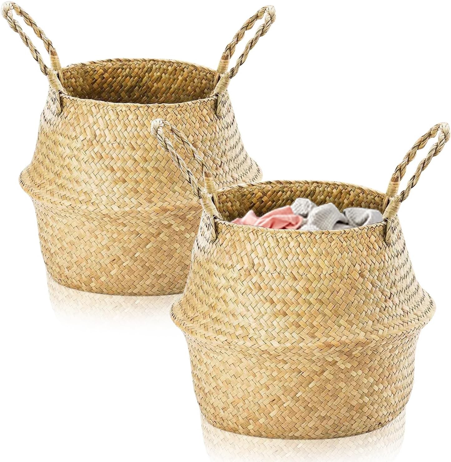DOKOT Seagrass Basket Belly Plant Pot Woven Basket With Handle, Foldable Laundry Basket Toys Storage (Natural)