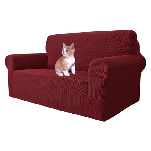 MAXIJIN Super Stretch Couch Cover for 2 Seater Couch, 1-Piece Universal Love Seat Covers Jacquard Spandex Sofa Protector Dogs Pet Friendly Fitted Loveseat Slipcover (2 Seater, Wine Red)