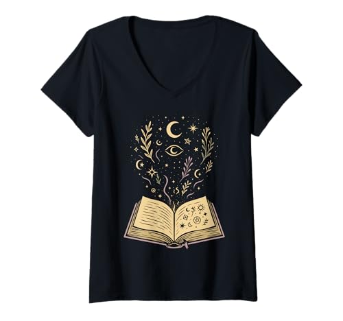 Womens Magic Book for Witches Celestial Moon and Star Symbolic Art V-Neck T-Shirt
