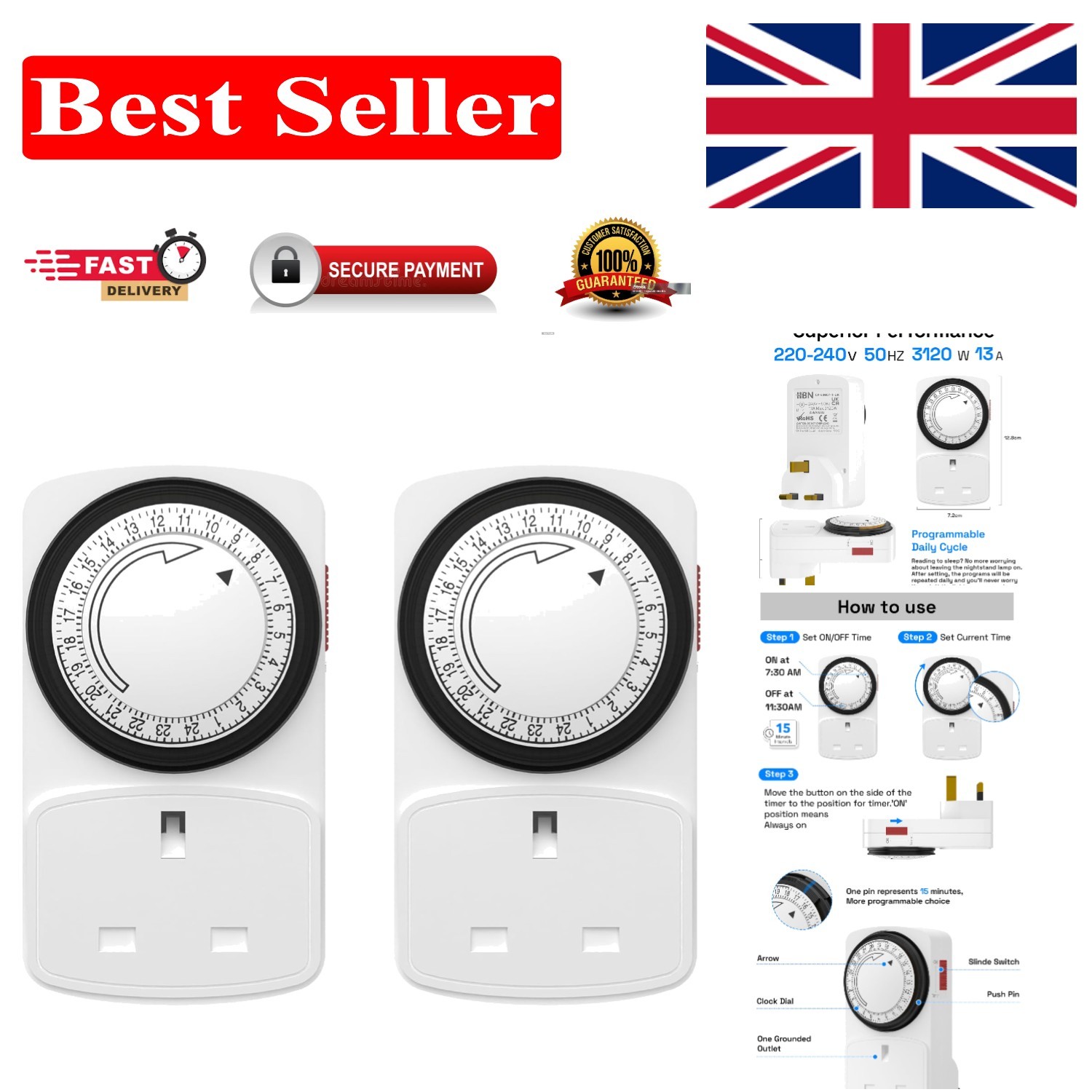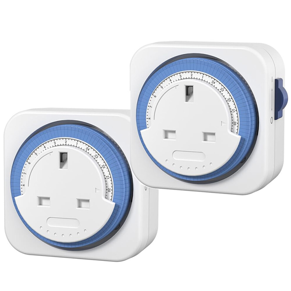 Double Dragon Pack of 2, 24 Hour Mechanical Timer Plug Socket| Programmable UK 3-Pin Timer Switch with 15-Minute Intervals |13A 3120W Energy-Saving Plug-in Timer for Lights, Appliances & Home Security
