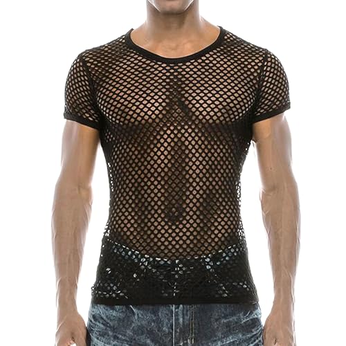 TUONYIS Men's Mesh Fishnet Men's Vest Short Sleeve T Shirt Fitted Muscle Top Summer Sexy Club Party Crop Tops Crew Neck Tee See Through Tops Fitted Workout Clubwear (UK, Alpha, One Size, Black)