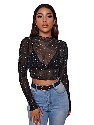 GORGLITTER Women's Star Print Mesh Top See Through Crop Tee Tops Lettuce Trim Long Sleeve Mock Neck T Shirts Sexy Sheer Crop Top Black M
