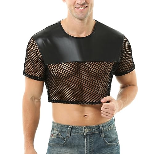 GENEMEN Mens Fishnet Shirts See Through Faux Leather Sexy Crop Tops Short Sleeve Mesh T Shirts (Black, L)