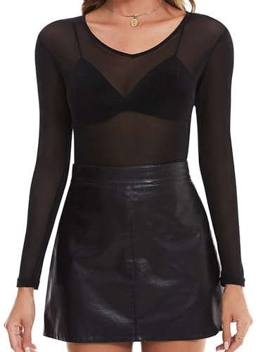 Zeagoo Women's Mesh Top Sheer Long Sleeve T-Shirts Sexy See Through Fitted Tops Transparent Mockneck Shirt for Party Clubwear Black XL