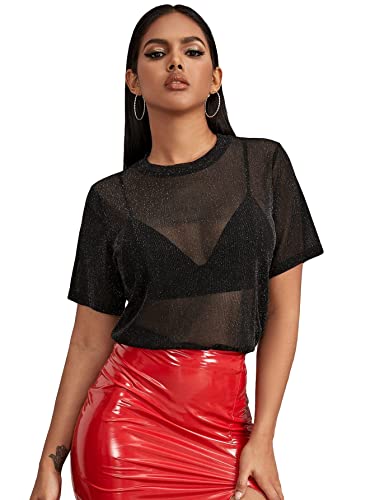 GORGLITTER Women's Sheer Mesh Glitter T Shirts Summer Tops Short Sleeve See Through Sexy T Shirts Clubwear Black M