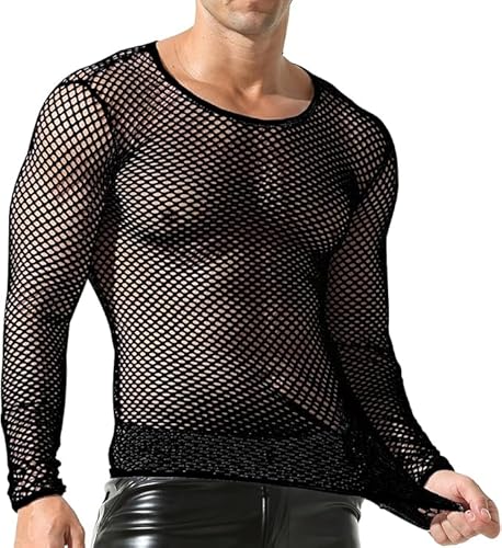 QiaTi Men's See Through T-Shirts Mesh Tops Fishnet Shirt Round Neck Undershirts Long Sleeve Black