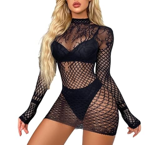 VicSec Women's Long Sleeve Fishnet Bodysuits Mesh Lace Bodydoll Stretchy Backless Leotard, Ladies See Through Chemise Hollow Out Bodystocking Teddy Underwear Clubwear Tops in Black One Size