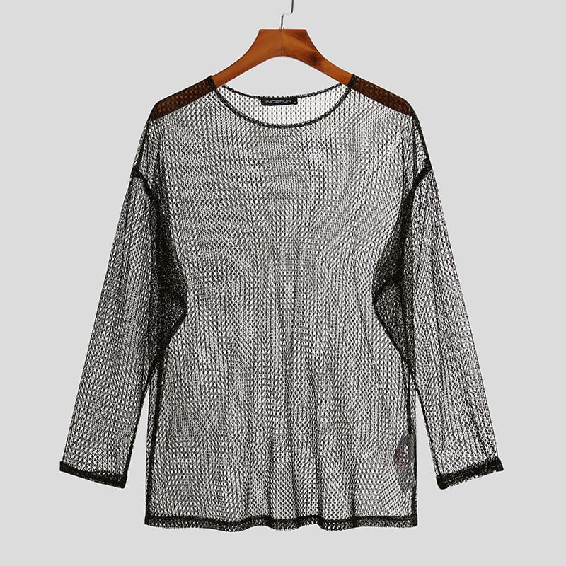 Men See Through Fishnet Tops Long Sleeve T Shirt Club Party Tee Casual Loose Tee