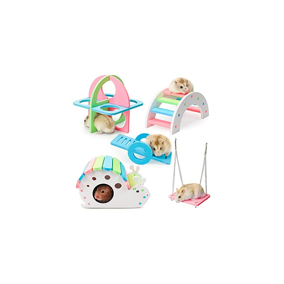 5 Pcs Hamster Toys Set Rainbow, DIY Hamster Hideout House Rainbow Bridge Swing and Seesaw, Pet Sport Exercise Toys Set Hamster Cage Accessories for