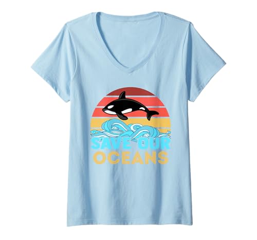 Women's Retro Orca Killer Whale Save The Ocean Marine Biologists V-Neck T-Shirt