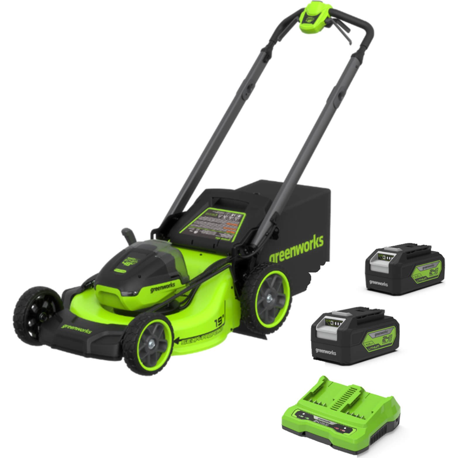 Greenworks MO48L 48v Cordless Brushless Self Propelled Rotary Lawnmower 460mm 2 x 4ah Li-ion Twin Battery Charger