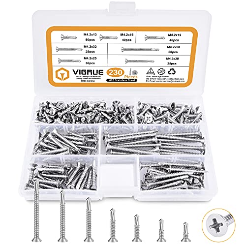 VIGRUE Pack of 230 Self-Tapping Screws, M4.2 Tapping Screws Self-Tapping Set, Phillips Drilling Screws, Self-Tapping Made of 410 Stainless Steel in Assortment Box