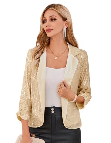 GRACE KARIN Women's Open Front Glitter Sequin Blazer 3/4 Ruched Sleeve Party Jackets for Going Out Light Gold XL