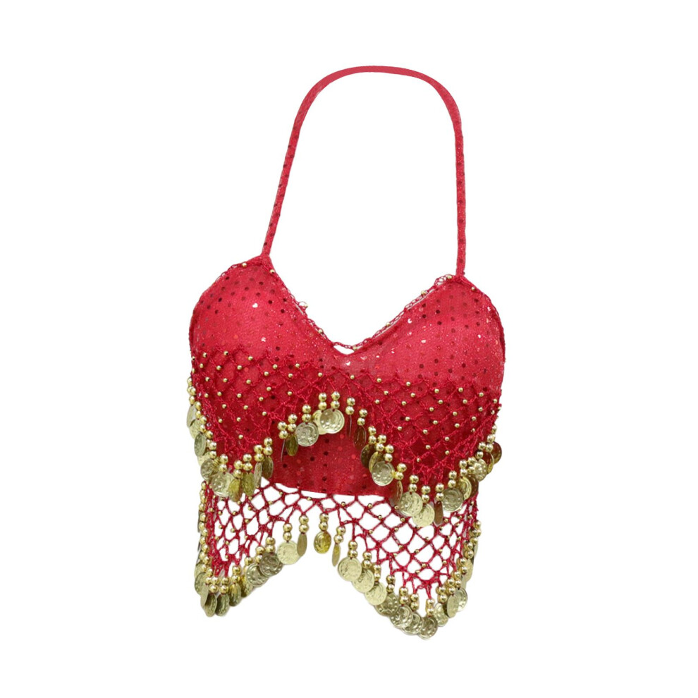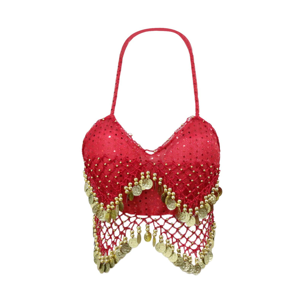 (Red, Length 30cm) Low Cut Sequin Tube Top Vest Womens Shimmer Belly Dance Performance