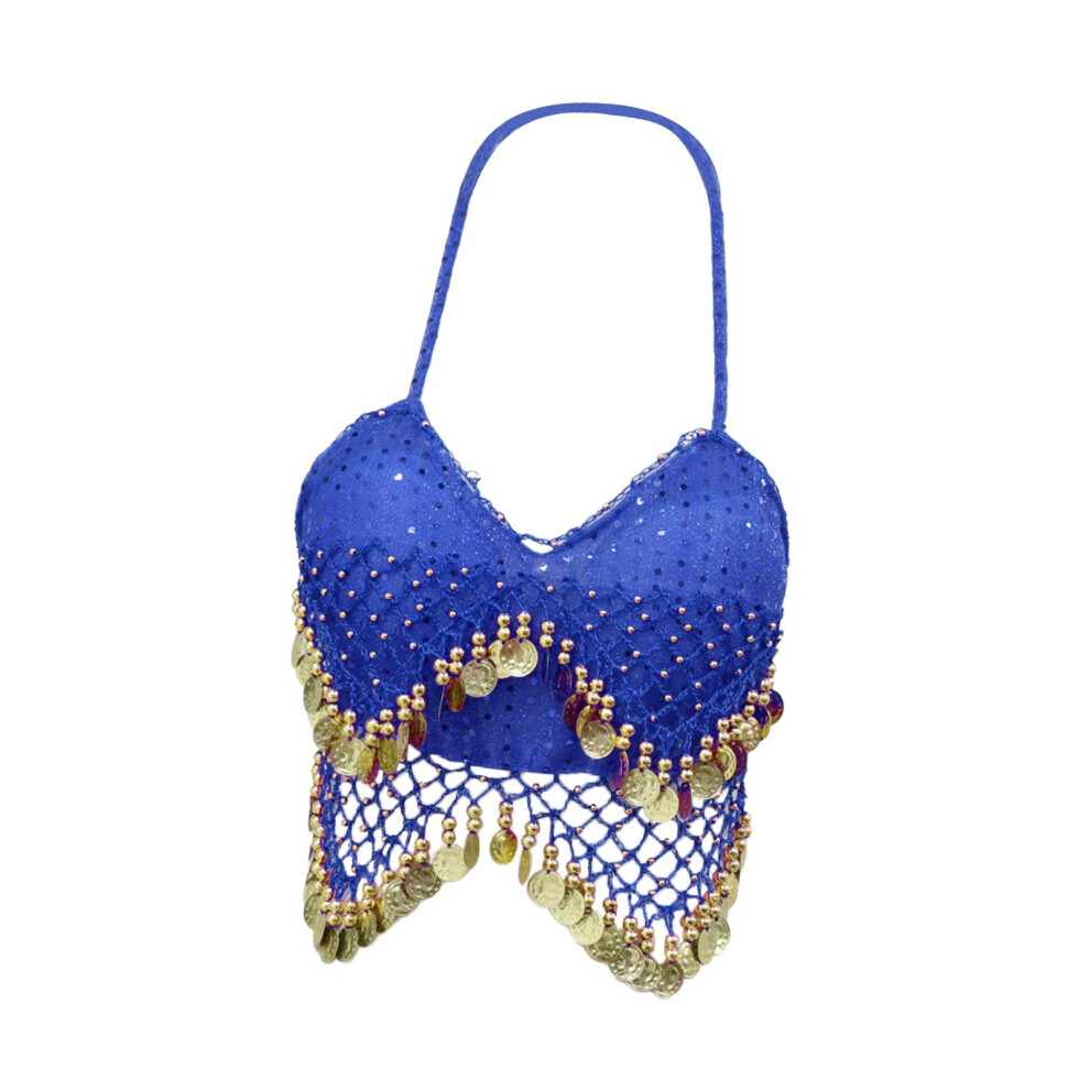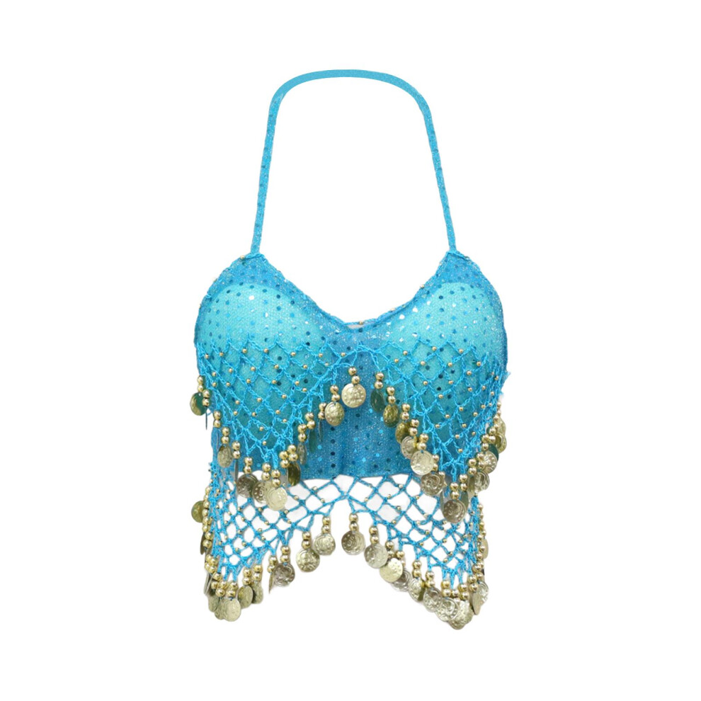 (Blue, Length 30cm) Low Cut Sequin Tube Top Vest Womens Shimmer Belly Dance Performance