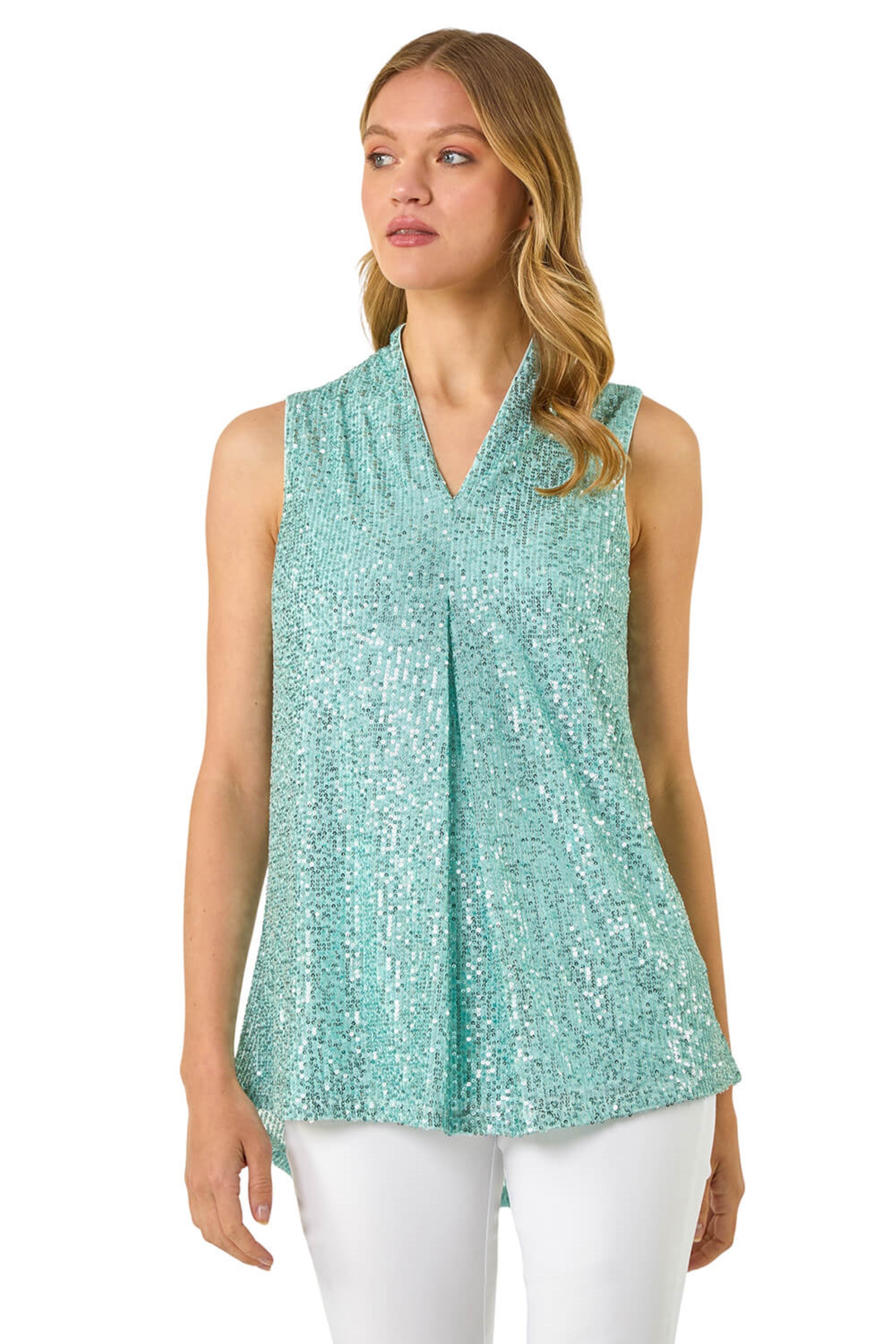 Roman Womens Sequin Pleat Front Vest Top - Turquoise - Size 10 UK