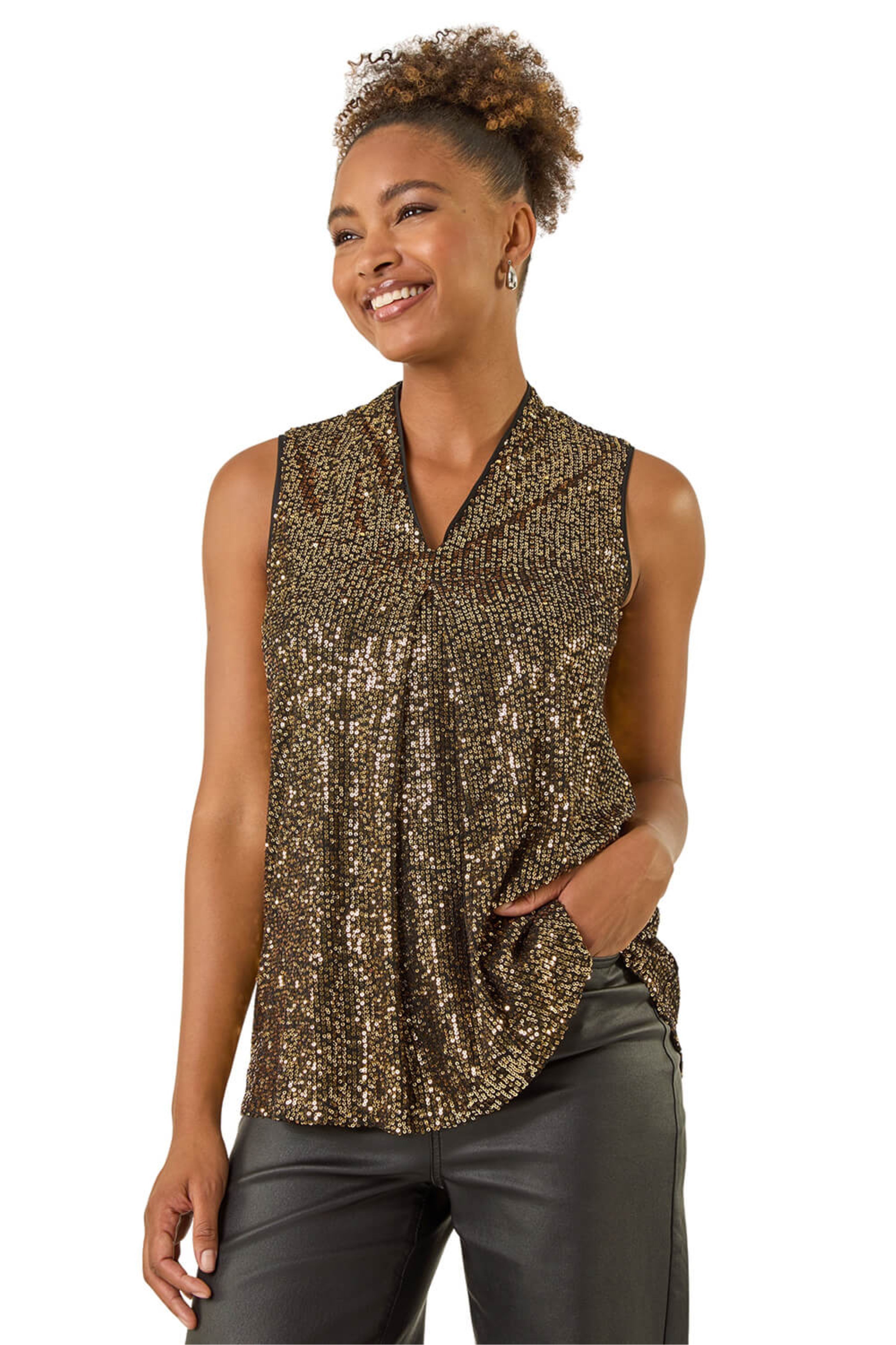Roman Womens Sequin V-Neck Vest Top - Gold - Size 12 UK
