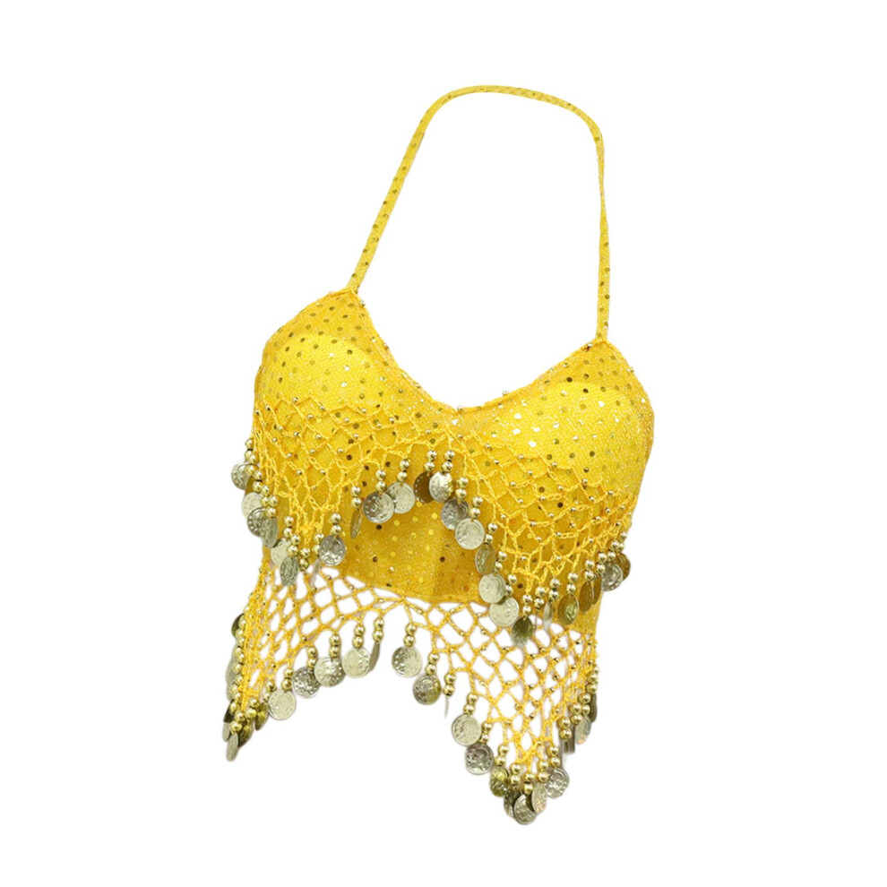 (Yellow, Length 30cm) Low Cut Sequin Tube Top Vest Womens Shimmer Belly Dance Performance