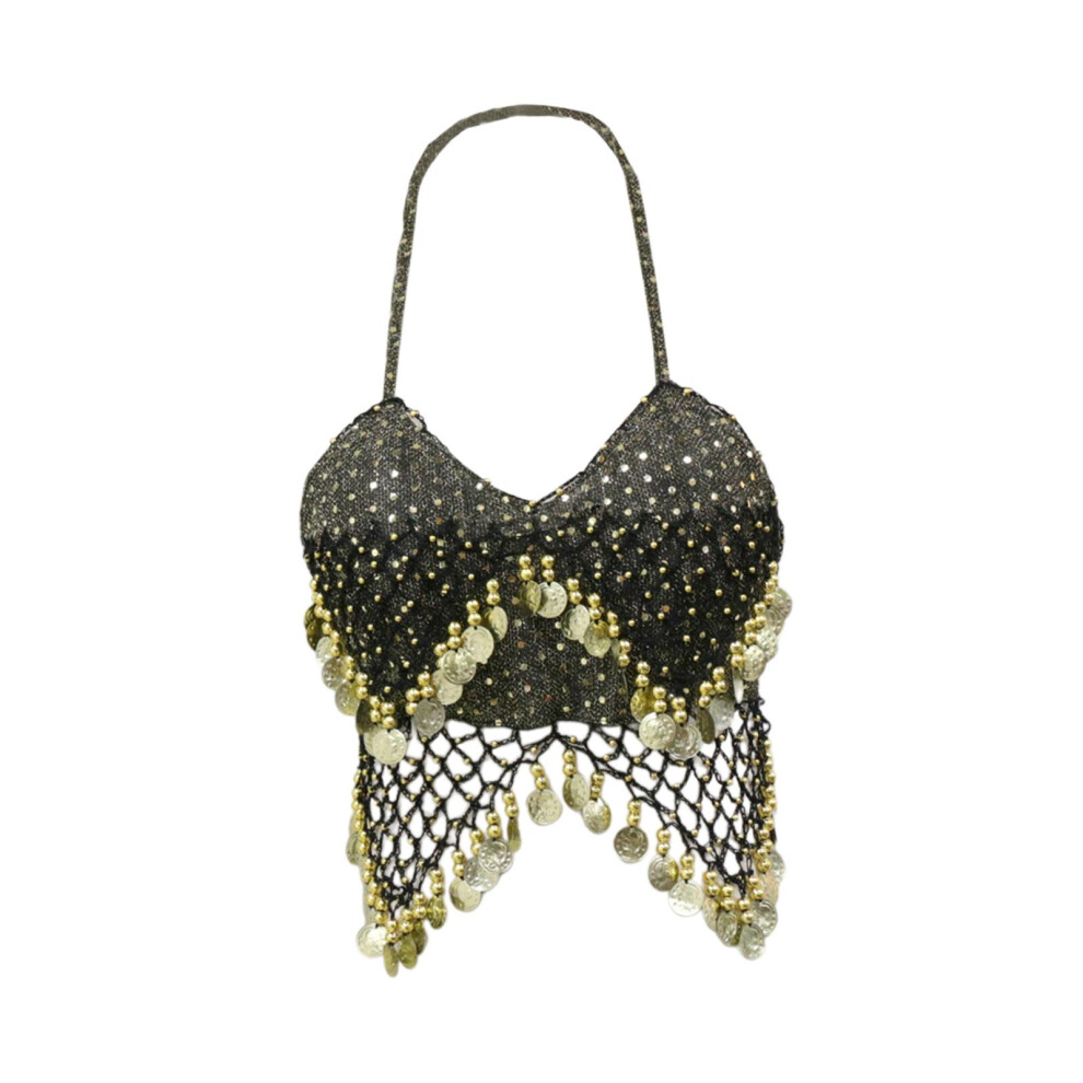 (Black, Length 30cm) Low Cut Sequin Tube Top Vest Womens Shimmer Belly Dance Performance