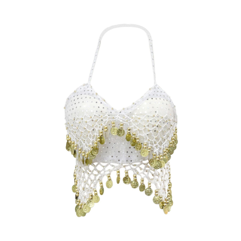 (White, Length 30cm) Low Cut Sequin Tube Top Vest Womens Shimmer Belly Dance Performance