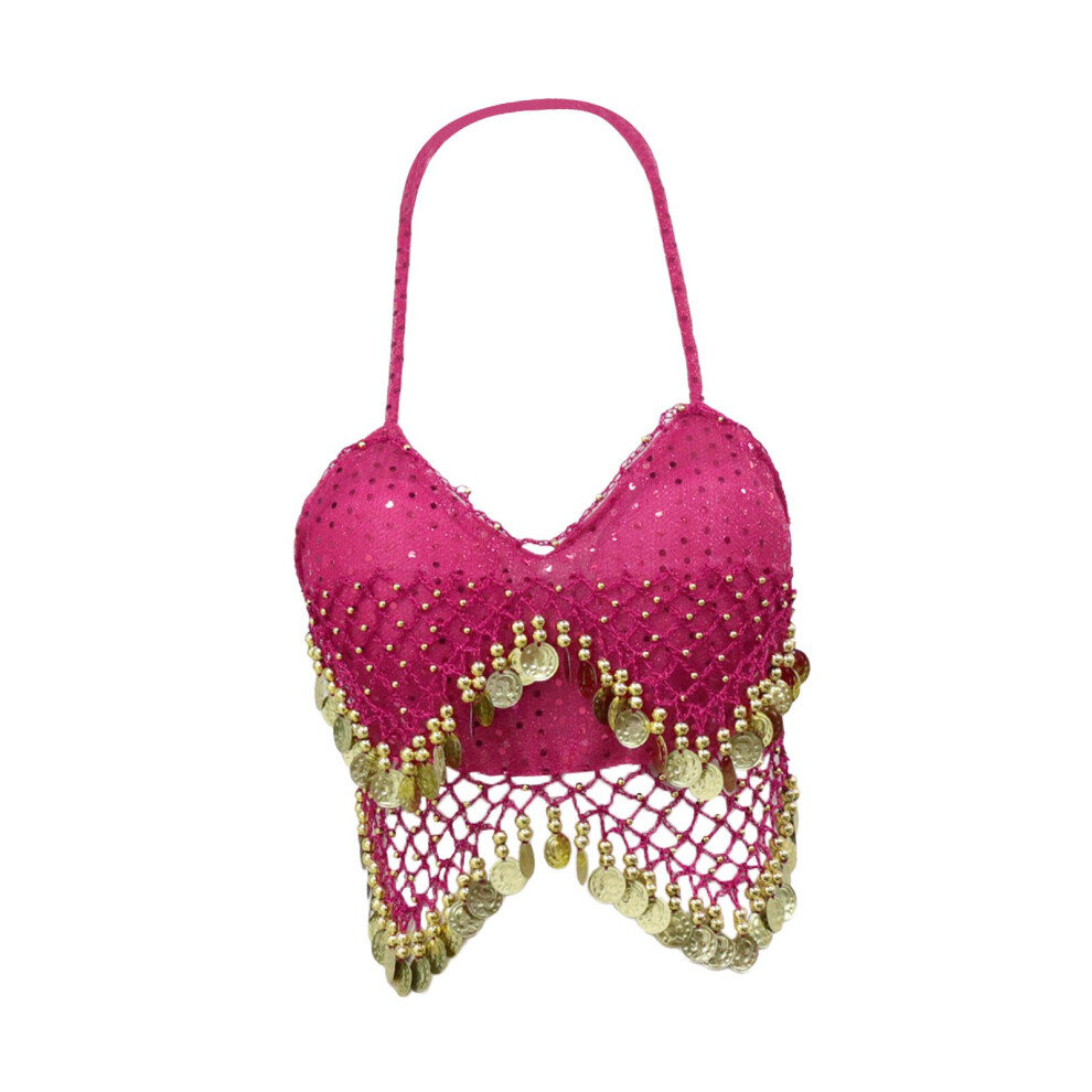 (Rose Red, Length 30cm) Low Cut Sequin Tube Top Vest Womens Shimmer Belly Dance Performance