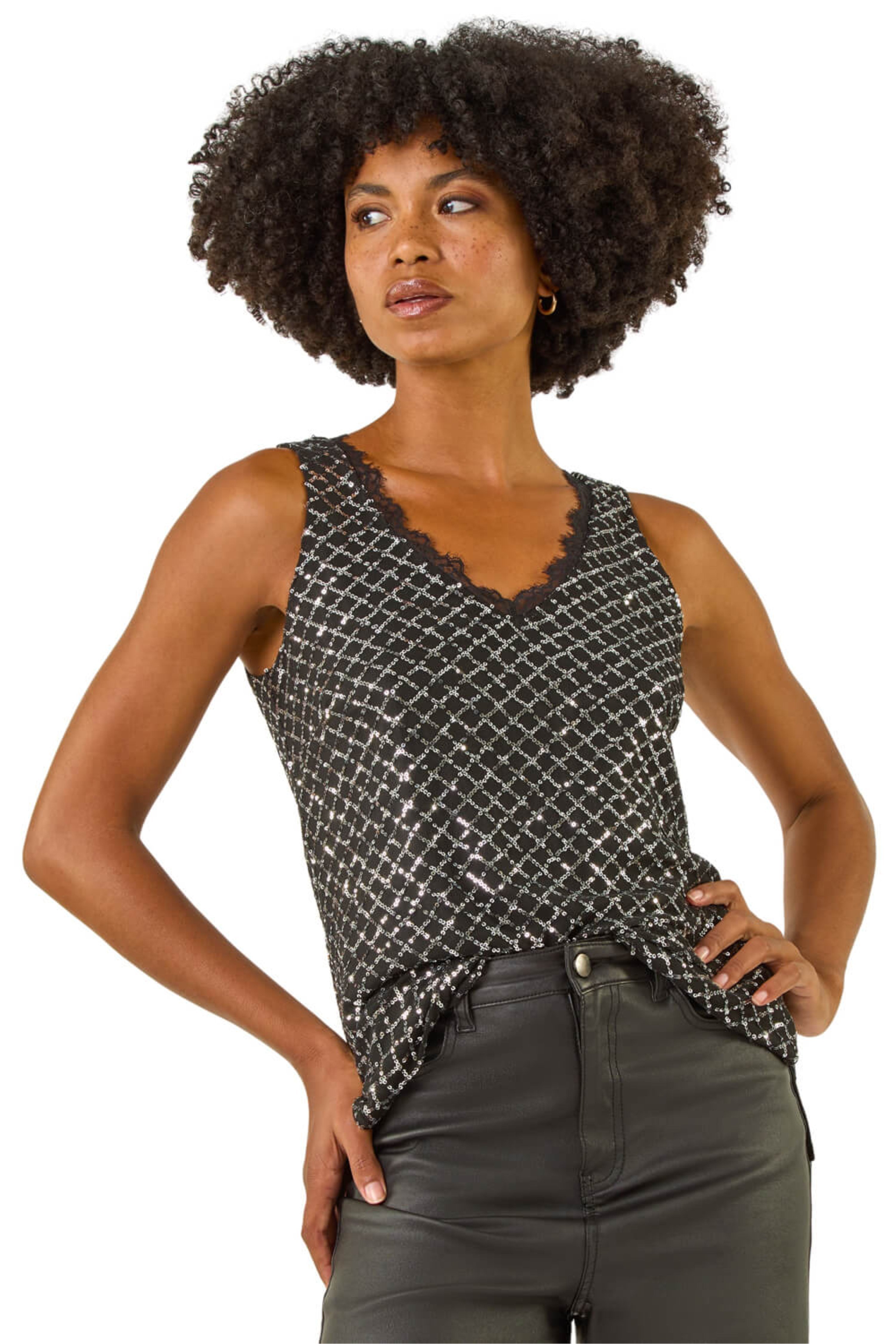 Roman Womens Diamond Lace Sequin Vest Top - Silver - Size 10 UK