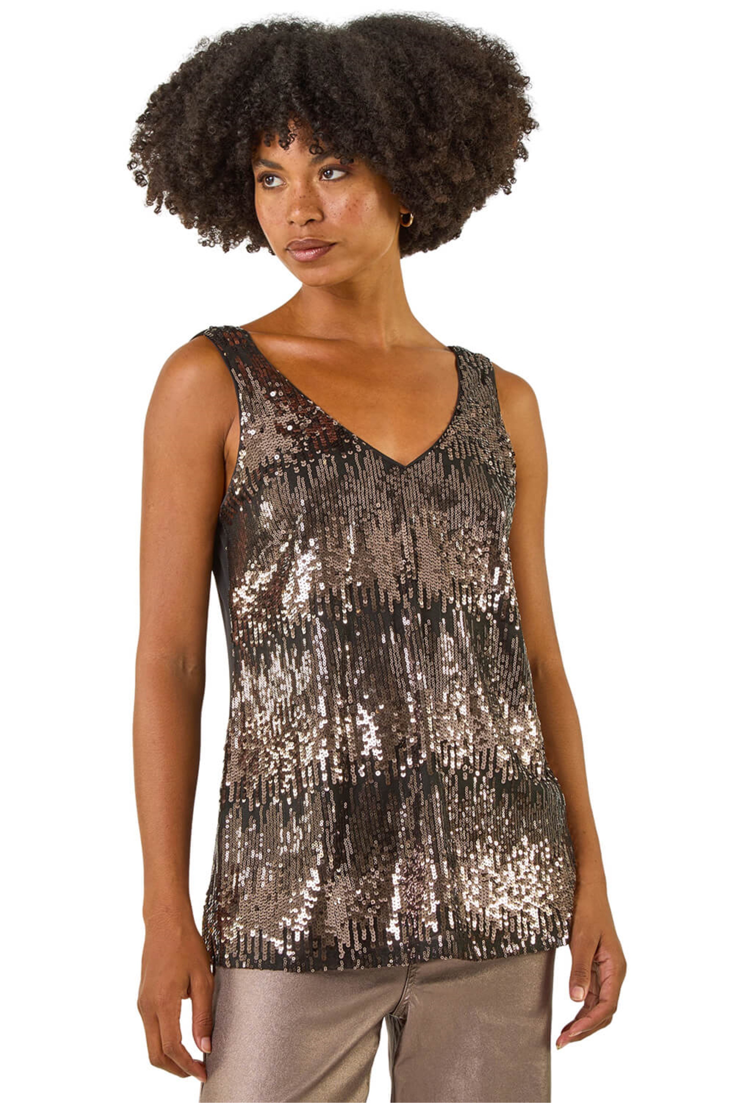 Roman Womens Sequin V-Neck Vest Top - Taupe - Size 12 UK