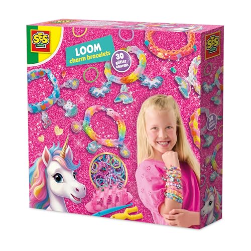SES Creative Unicorn Loom Bracelet Set – 600 Bands, Beads, Glitter Unicorn Charms & Weaving Tools – DIY Jewellery Craft Kit for Kids