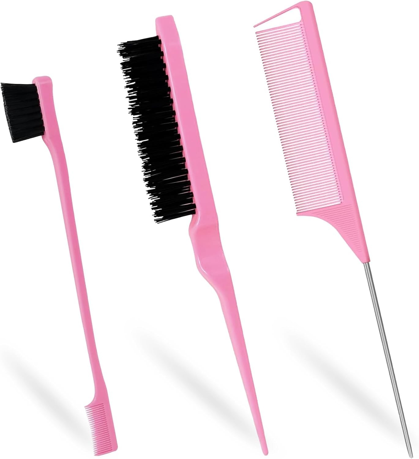 Sularpek 3 Pcs Slick Brush Set, Plastic Bristle Hair Brush Teasing Comb Edge Hair Brush Teasing Brush Set, Rat Tail Comb Double Sided Edge Brush, for Hairdresser Women Baby Children (Pink)