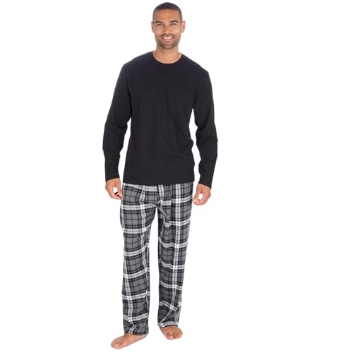 Style It Up Mens Long Sleeve Plain Top Checked Bottoms Sleepwear Pajama Set Crew Neck Warm Cozy Super Soft Adults Loungewear (GREY-BLACK, L)