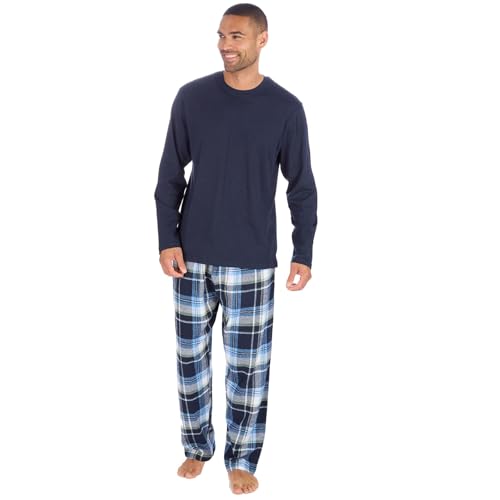 Style It Up Mens Long Sleeve Plain Top Checked Bottoms Sleepwear Pajama Set Crew Neck Warm Cozy Super Soft Adults Loungewear (BLUE-NAVY, L)