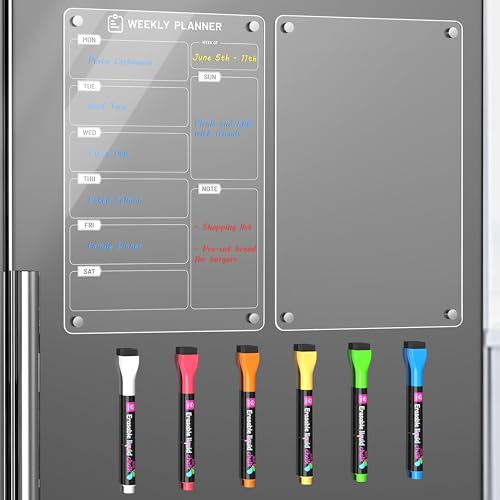 Langaelex 2 Set of Magnetic Weekly Planner for Fridge - Acrylic Meal Planner Boards with 6 Chalk Markers for Kitchen Home, Food Planning, Shopping List - A4 (20 x 30 cm)