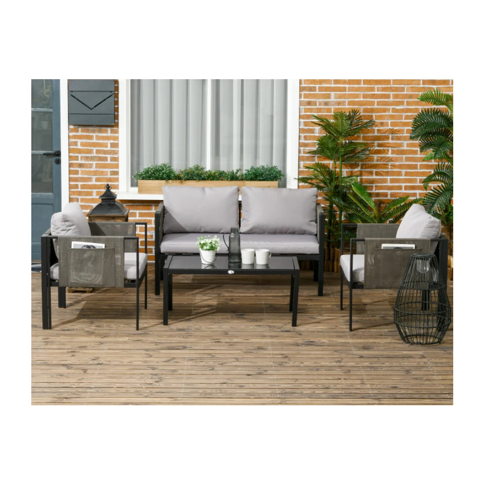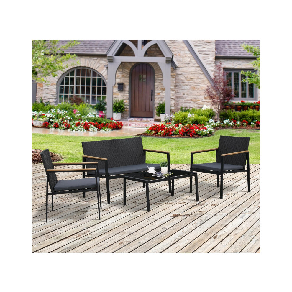 Home Detail 4 Piece Garden Furniture Set with Garden Sofa, Chairs and Table, Outdoor 4 Seater Garden Conversation Set (Black with Dark Grey Cushions)