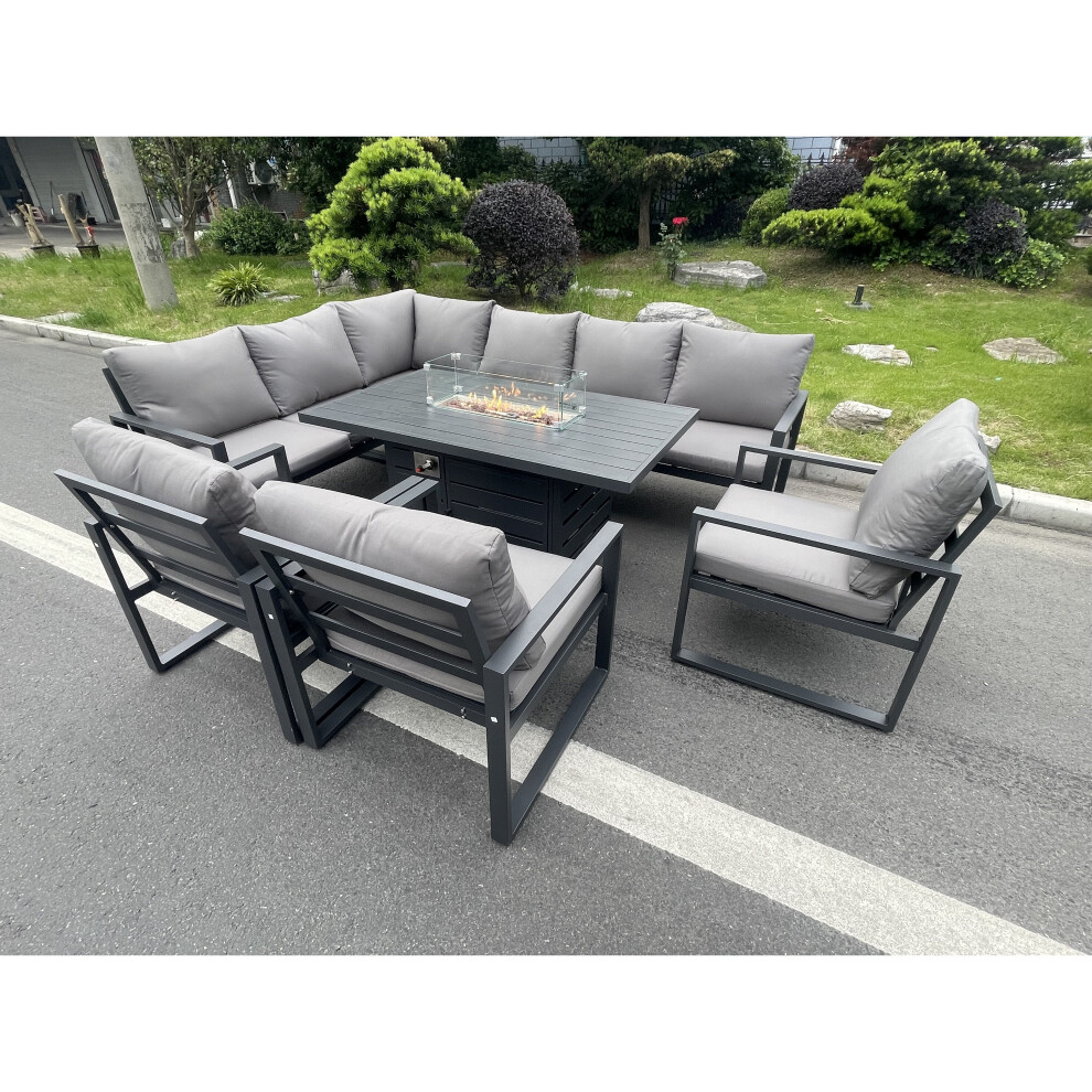 Fimous Aluminum Outdoor Garden Furniture Set Corner Sofa 3 PC Chairs Gas Fire Pit Dining Table Set Dark Grey 8 Seater