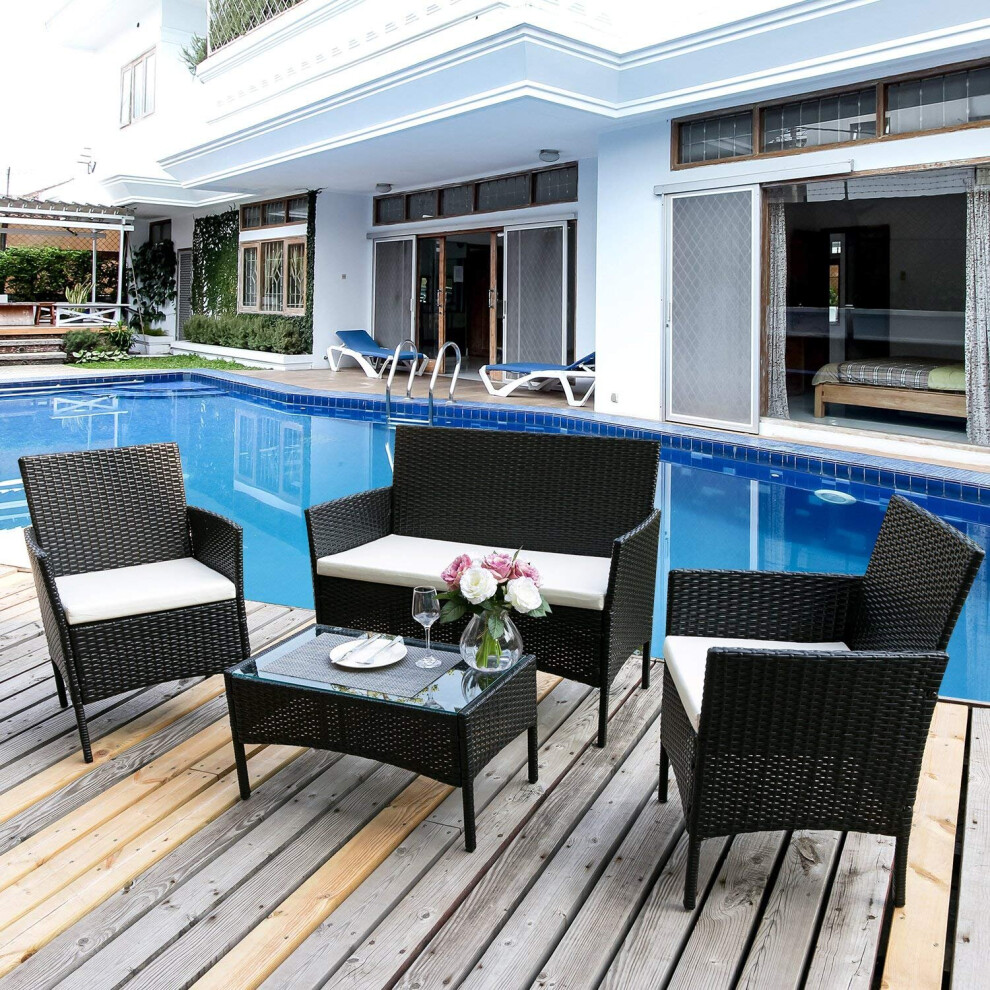 (Black) Black Rattan Furniture Set for Outdoor Garden or Indoor Conservatory, 4 Pcs Set Rattan Sofa Chairs, Rattan Table with Tempered Glass Table Top