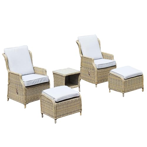 SHATCHI Sorrento Luxury 5 Piece Rattan Garden Furniture Set Aluminium Recliner Sofa Chairs, Glass Top Coffee Table, Footstools, Cushions for Outdoor Patio Lounge Conservatory Balcony